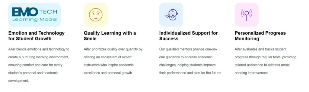 Aifer is revolutionizing the learning experience with our unique EmoTech Learning System, combining advanced technology with emotional care. We prioritize student well-being alongside academic growth, creating a supportive environment where learning thrives. Our innovative platform fosters an engaging, personalized journey, ensuring that students feel both empowered and understood. By blending emotional intelligence with cutting-edge educational tools, Aifer offers a truly holistic approach to learning. This integration of care and technology allows students to excel academically while maintaining their mental and emotional health, making Aifer the future of joyful and effective education.